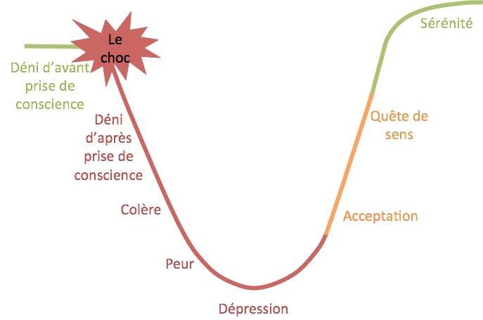 - Le choc. C’est le début du processus de deuil. On accepte de laisser entrer le discours alarmiste ou il y en a un qui fait particulièrement mouche. Les informations que nous percevons maintenant et les constatations que nous faisons ensuite ne font que confirmer l’ampleur des dégâts. On se sent démuni, perdu, impuissant. On est fortement déstabilisé et on peut rester tétanisé un certain temps en état de sidération.